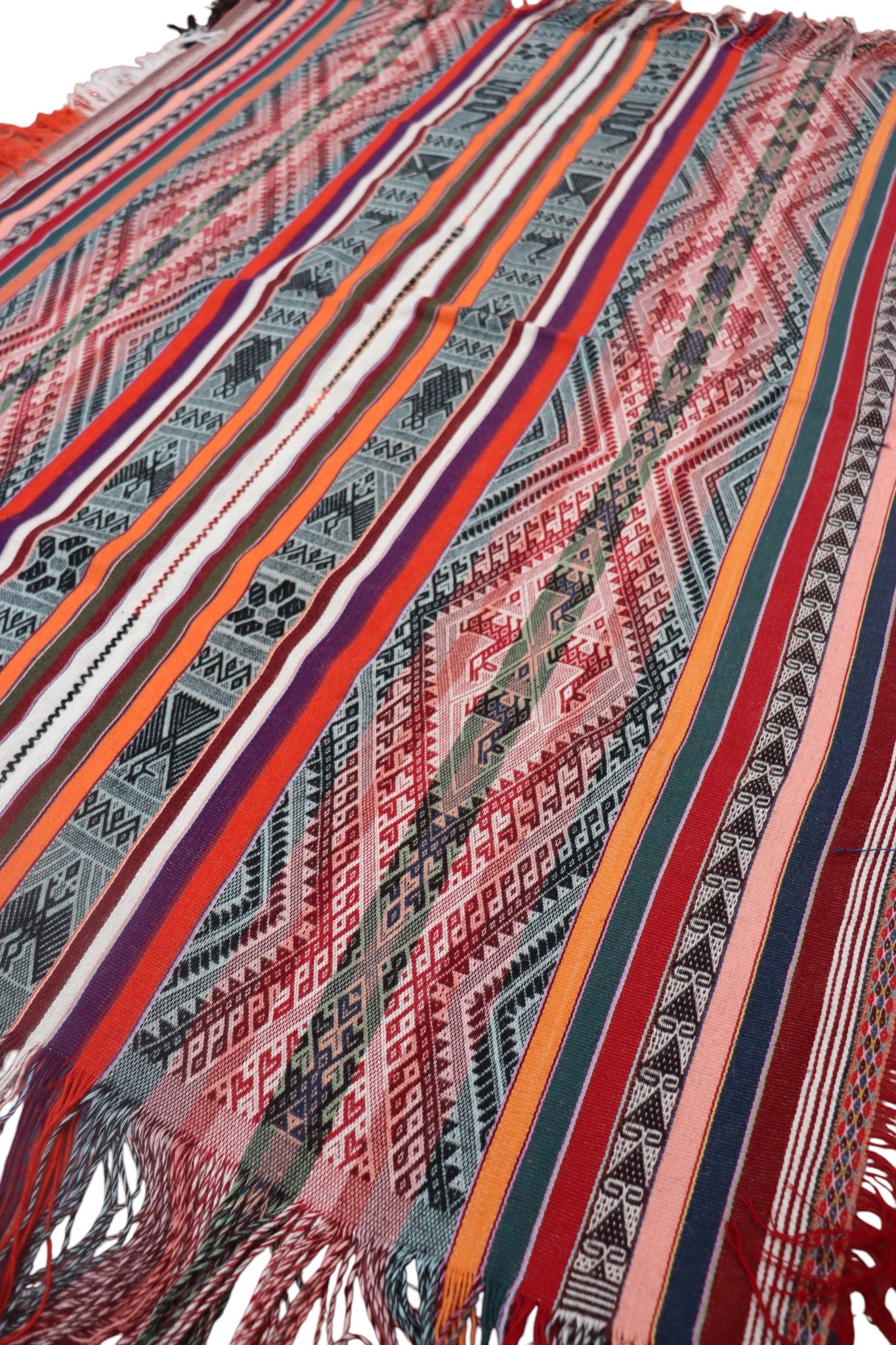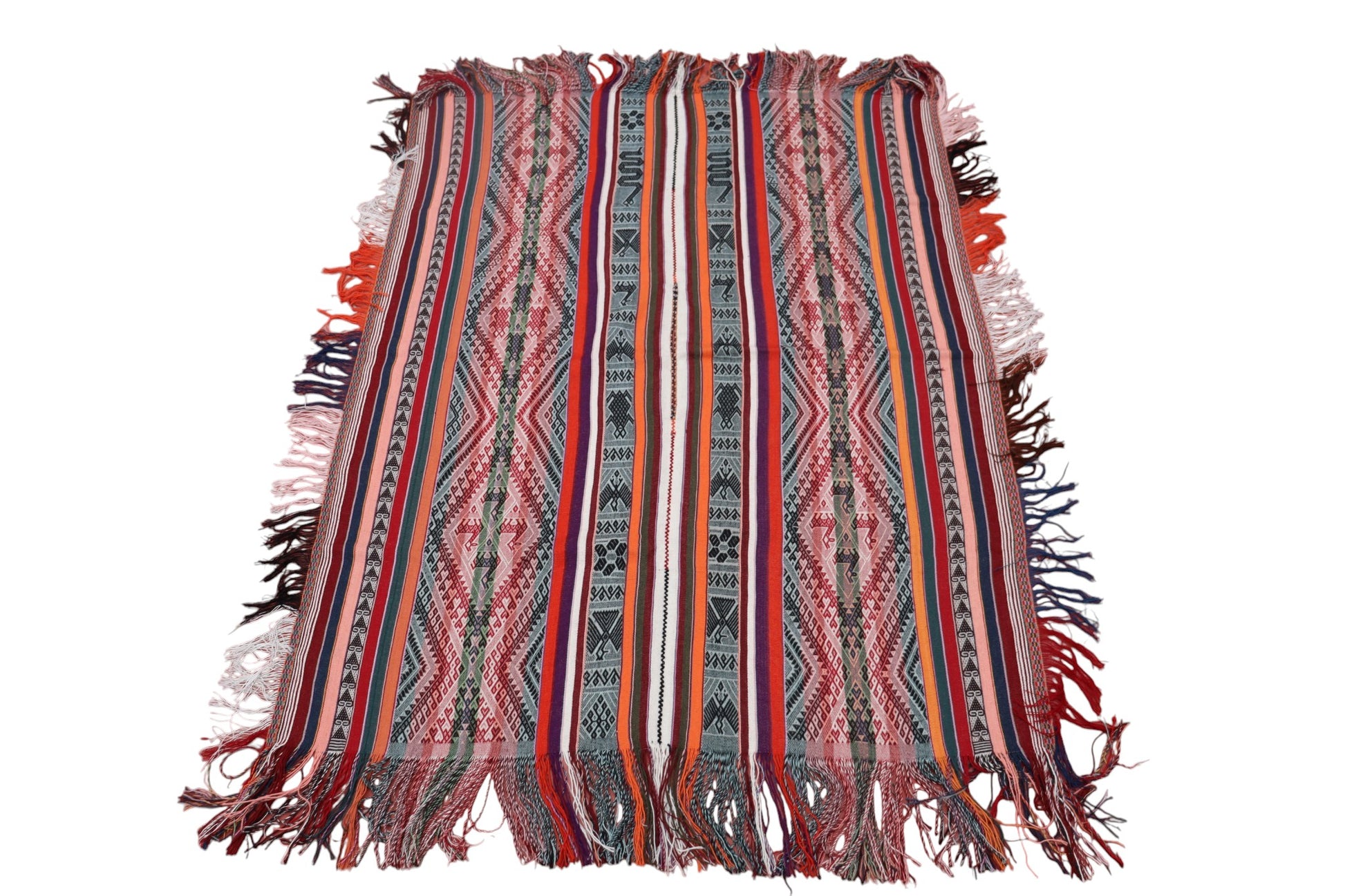 Description: This is a colorful ceremonial men poncho featuring various animal designs representative of Andean cosmology: the toad (a symbol of fertility and connection to Pachamama), the snake (symbolizing wisdom), the llama (representing perseverance and unconditional love), the condor (teaching liberation).