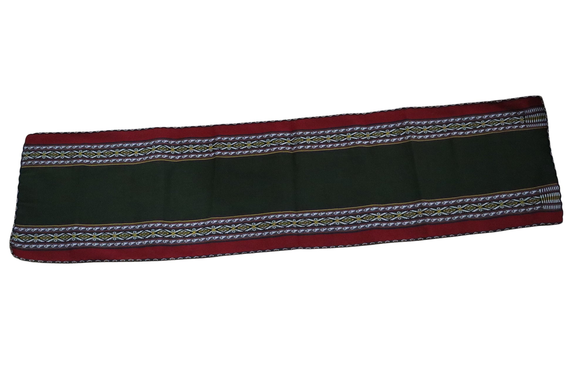 This handmade table runner is a one-of-a-kind piece, crafted by artisans from Chinchero, where each design reflects the cultural identity of this Andean community, known as the Land of the Rainbow. Along the edges, the Nawi Awapa motif (“the eye of the princess”) stands out as a traditional symbol unique to Chinchero, believed to provide protection and spiritual connection within the textile.